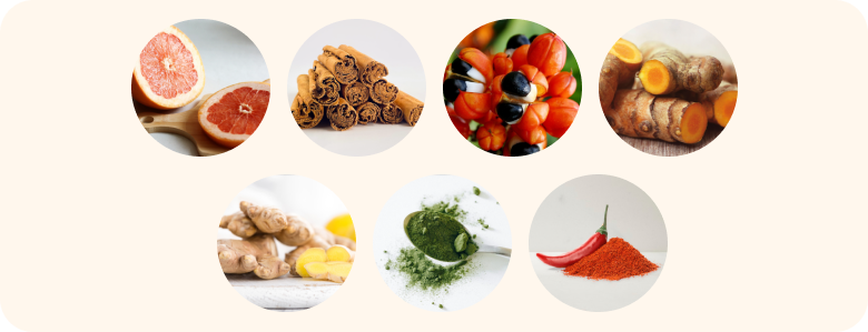 Laranja Moro, Canela do Ceilão, Guaraná, Cúrcuma, Gengibre, Matchá e Pimenta-caiena.